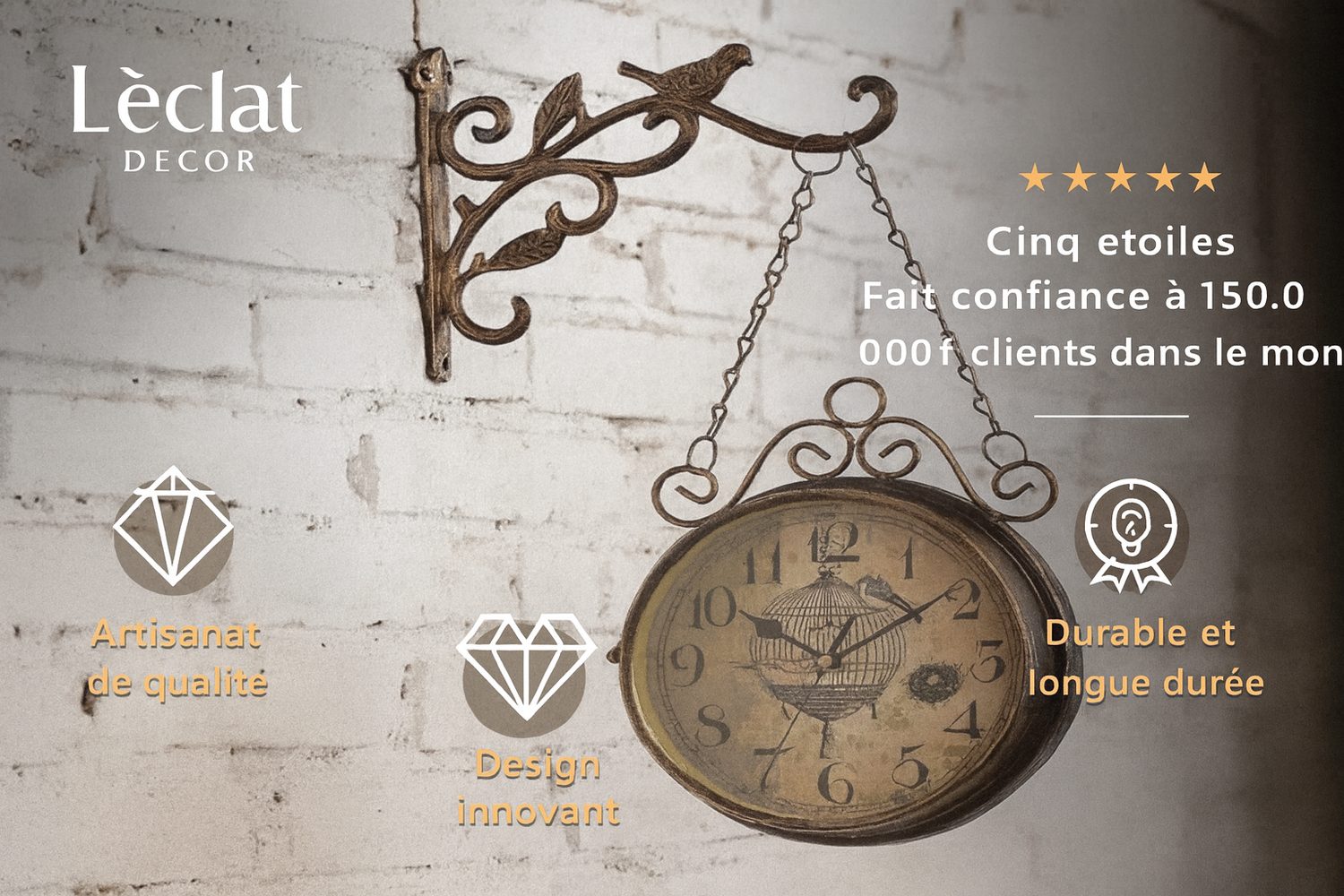 Idéale pour un salon, un restaurant ou une cuisine, cette horloge de gare double face ancienne enrichira chaque espace de sa présence. Elle sera non seulement un moyen pratique de suivre le temps mais aussi un véritable objet d'art. Facile à installer et merveilleusement pratique, que vous souhaitiez embellir un mur de votre maison ou de votre restaurant, ou bien même que vous souhaitez offrir un cadeau unique à un de vos proches, cette horloge sera le choix parfait. Accrochez-la et laissez son charme opérer.